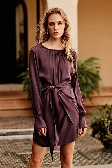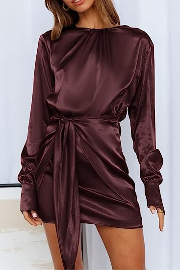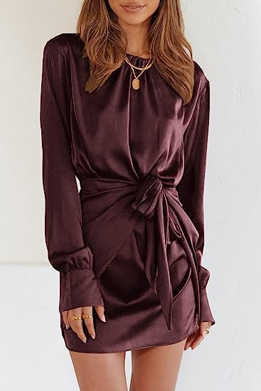PRETTYGARDEN Women's 2023 Spring Satin Dress Long Sleeve Tie Waist Elegant Cocktail Party Mini Dresses